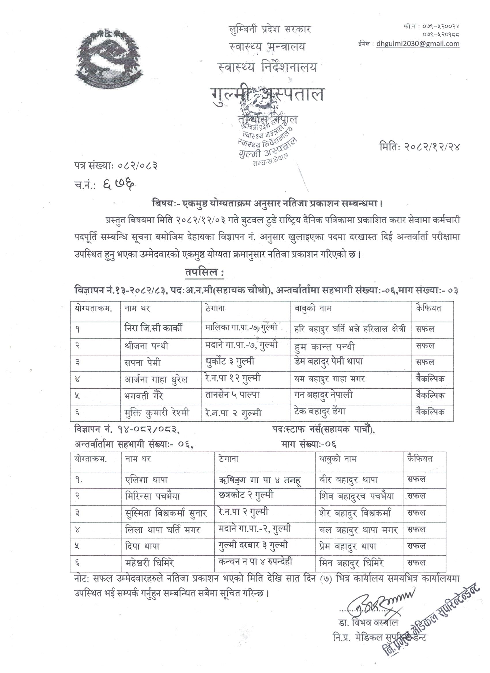 अ.न.मी र स्टाफ नर्स पदको एकमुष्ट योग्यताक्रम अनुसार अन्तिम नतिजा प्रकाशन सम्बन्धमा ।